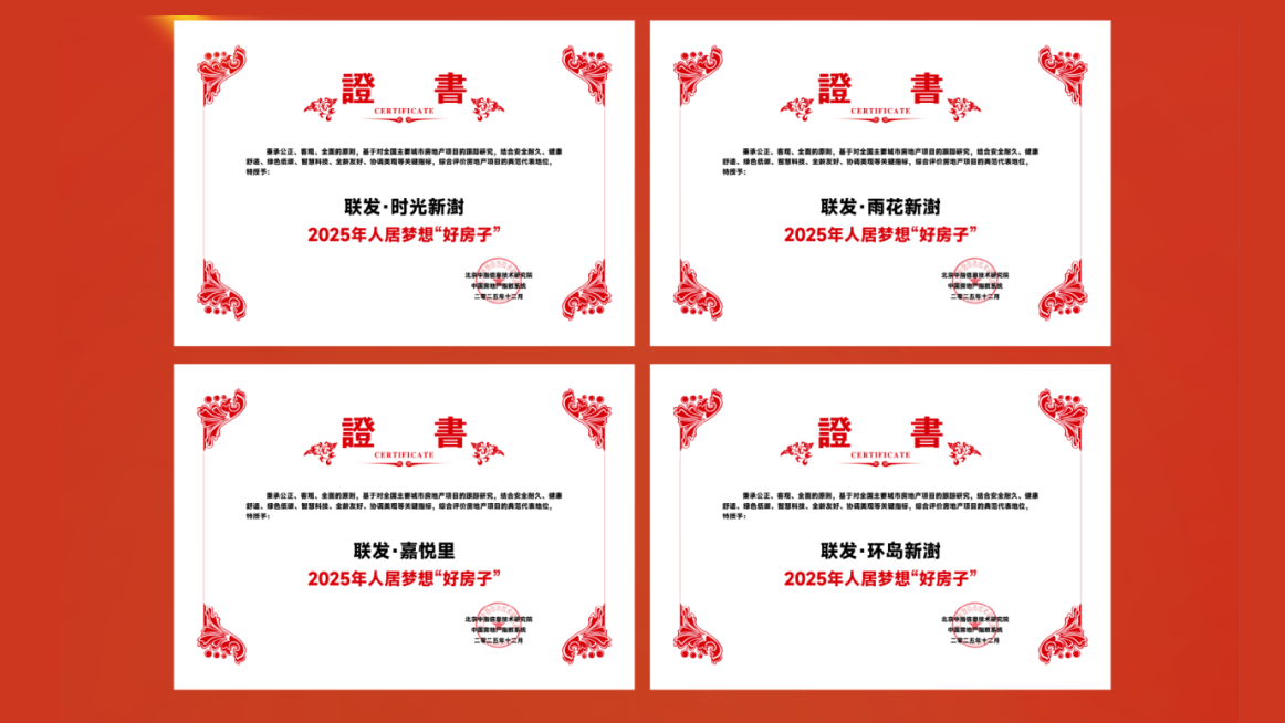 12月11日,由北京中指信息技术研究院主办、中国房地产指数系统中国物业服务指数系统承办的“2025中国房地产大数据年会暨2026中国房地产市场趋势报告会”在北京召开。联发集团在2025年中国房地产产品力测评中再获行业认可:获评“中国房地产产品力优秀企业”称号;集团旗下四大标杆项目“上海·时光新澍”“南京·雨花新澍”“厦门·嘉悦里”“厦门·环岛新澍”,凭借产品设计、精工品质与对当代居住需求的深度回应,齐齐上榜2025年人居梦想“好房子”名单。